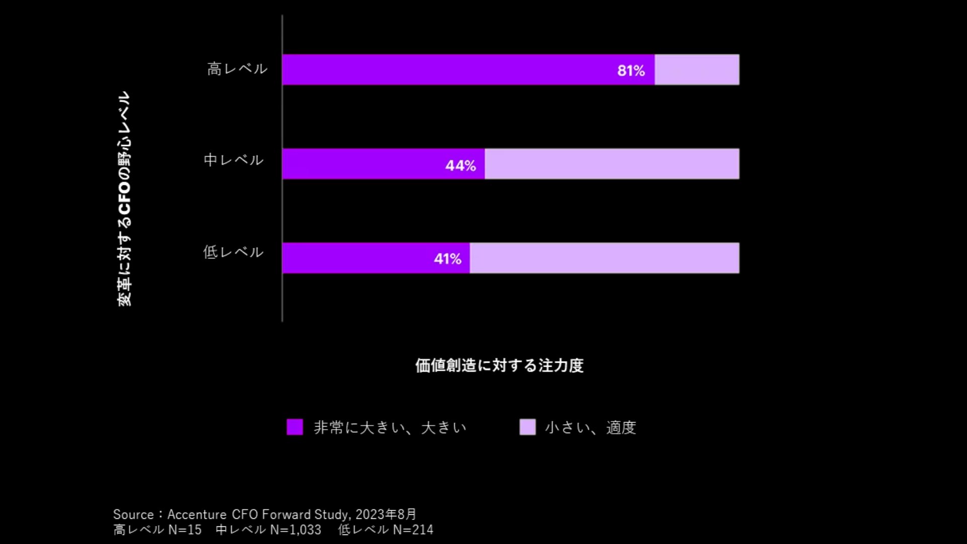 企業の再創造に対して野心的なCFOは、価値創造に注力しています。野心的なCFOの81%は、達成したい価値を明確にして変革に着手しています。この割合は、野心が低いまたは中程度のCFOの約2倍です(下記参照)。